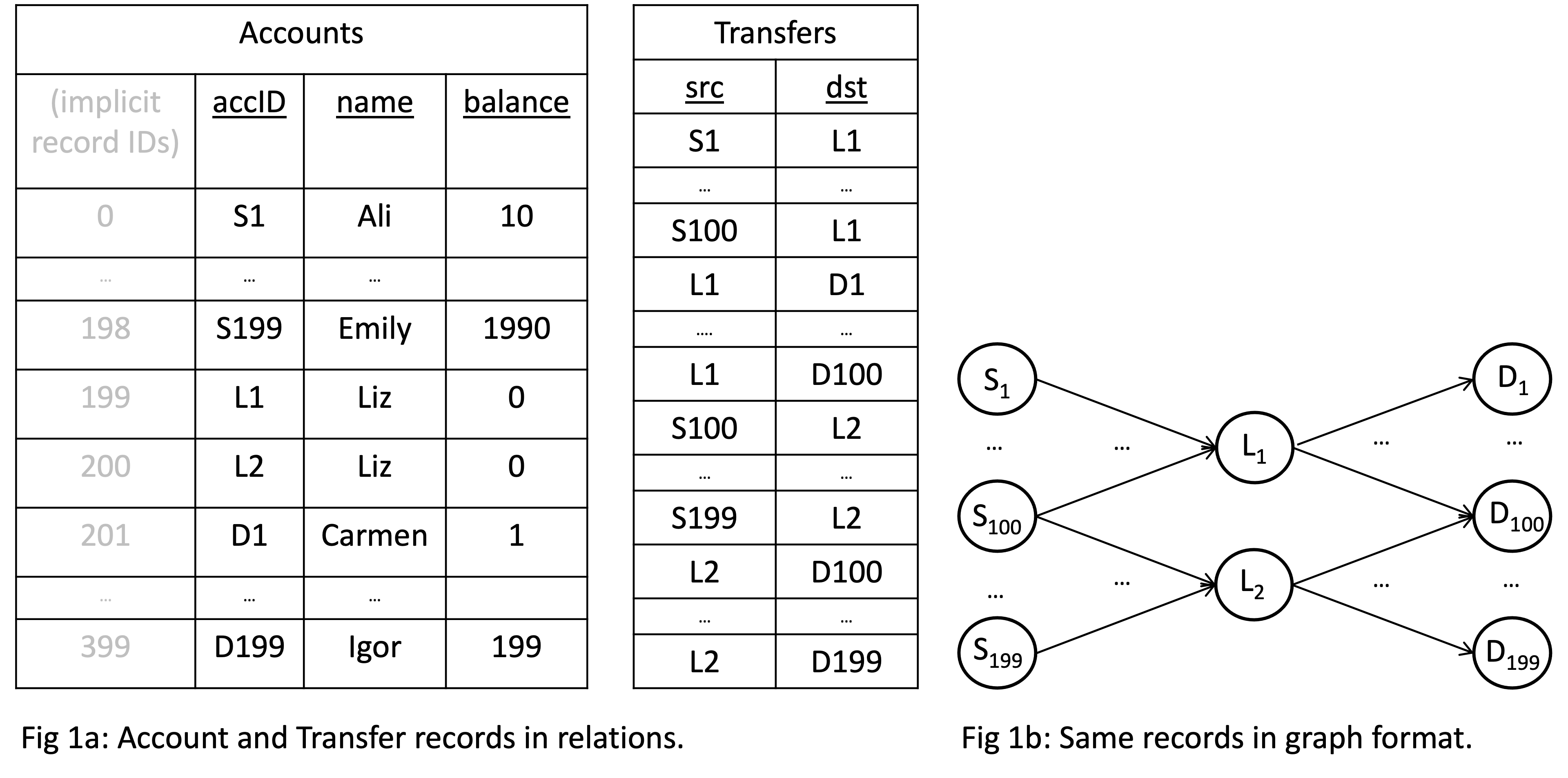 Note that GDBMSs are able to avoid scans of entire files because notice that they do the join on internal record/node IDs, which mean something very specific. If a system needs to scan the name property of node with record/node ID 75, it can often arithmetically compute the disk page and offset where this is stored, because record IDs are dense, i.e., start from 0, 1, 2…, and so can serve as pointers if the system’s storage design exploits this. This is what I was referring to as “Predefined/pointer-based joins” in my previous blog post. This is a good feature of GDBMSs that allows them to efficiently evaluate the joins of node records that are happening along the “predefined” edges in the database. I don’t know of a mechanism where RDBMSs can do something similar, unless they develop a mechanism to convert value-based joins to pointer-based joins. See my student Guodong’s work last year in VLDB of how this can be done. In Kuzu, our sideways information passing technique follows Guodong’s design in this work. ↩