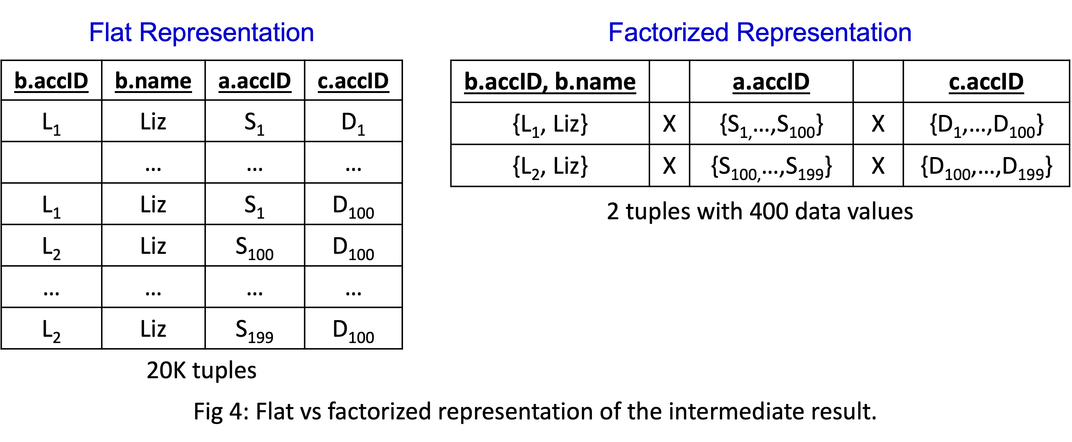 The interpretation of plans is that tuples are flowing from the bottom to top and each operator will take in sets of tuples and produce sets of tuples (in a pipelined fashion). The key motivation for factorization is that what flows between operators are flat tuples. When the joins are m-n, this leads to many data repetitions, which one way or another leads to repeated computation in the operators. For example, the final projection operator in our example would take the table shown in Figure 4 (left).