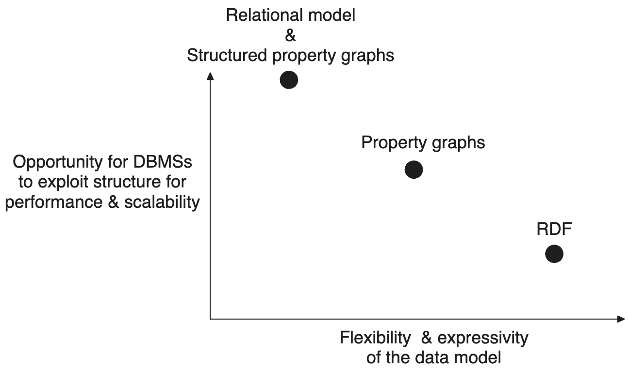 Flexibility: The relational model is located as the left-most point because it is the most “rigid”, i.e., the most structured data model. RDF is the right-most point because it is the most flexible model. The original PG model introduced by Neo4j falls somewhere in between. On the one hand, PGs allow putting arbitrary key-value pairs on node and relationship records, so they provide more flexibility than the relational model. But in PG, you cannot construct proper type hierarchies as in RDF, nor can you model information about types of relationships as in RDF. RDF has a great foundation in knowledge representation and reasoning, so its expressiveness is very well thought out.