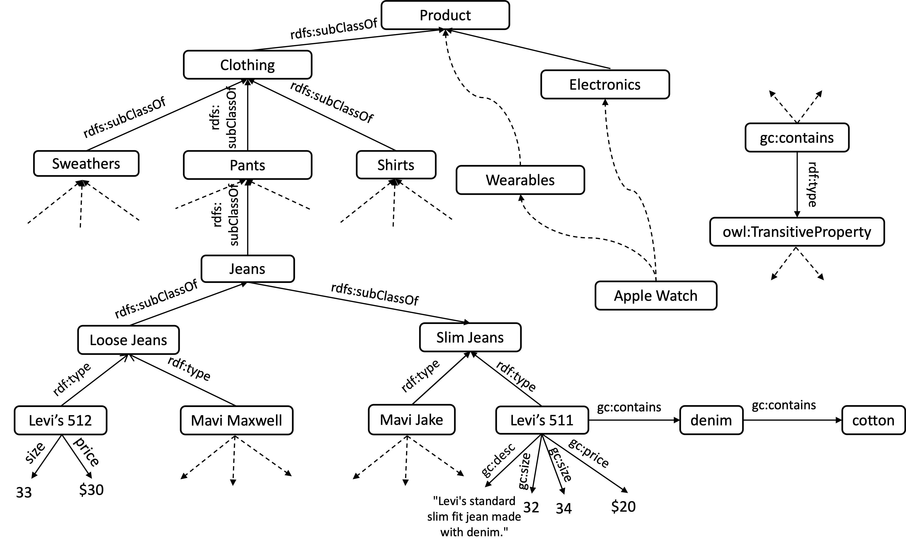 that this implies, as expected, that gc:Levis-511 is a type of gc:Jeans (<gc:Levis-511, rdf:type, gc:Jeans>)