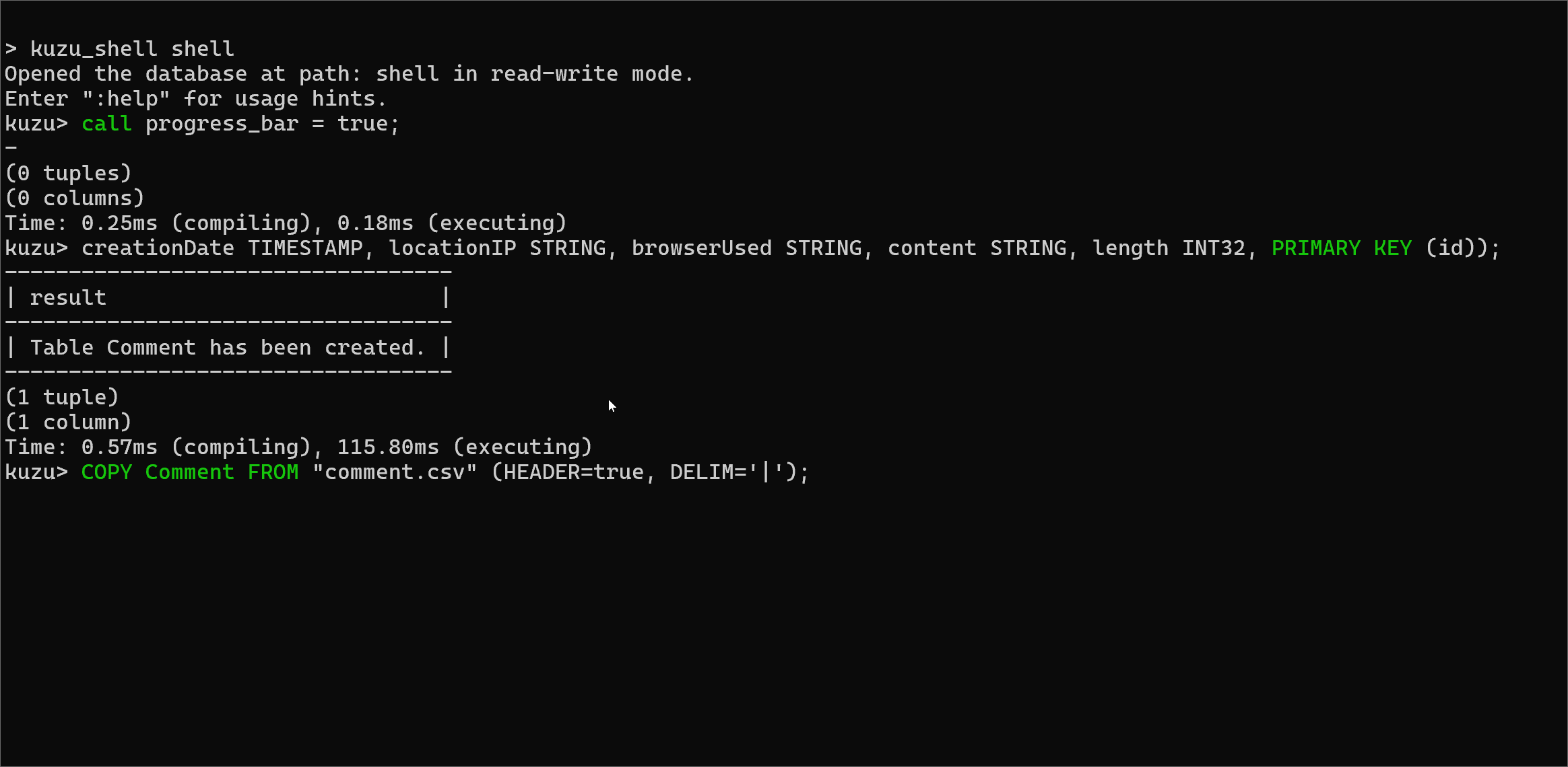 executed. The progress bar is only available in the CLI and Kuzu Explorer, and you have to enable it prior to