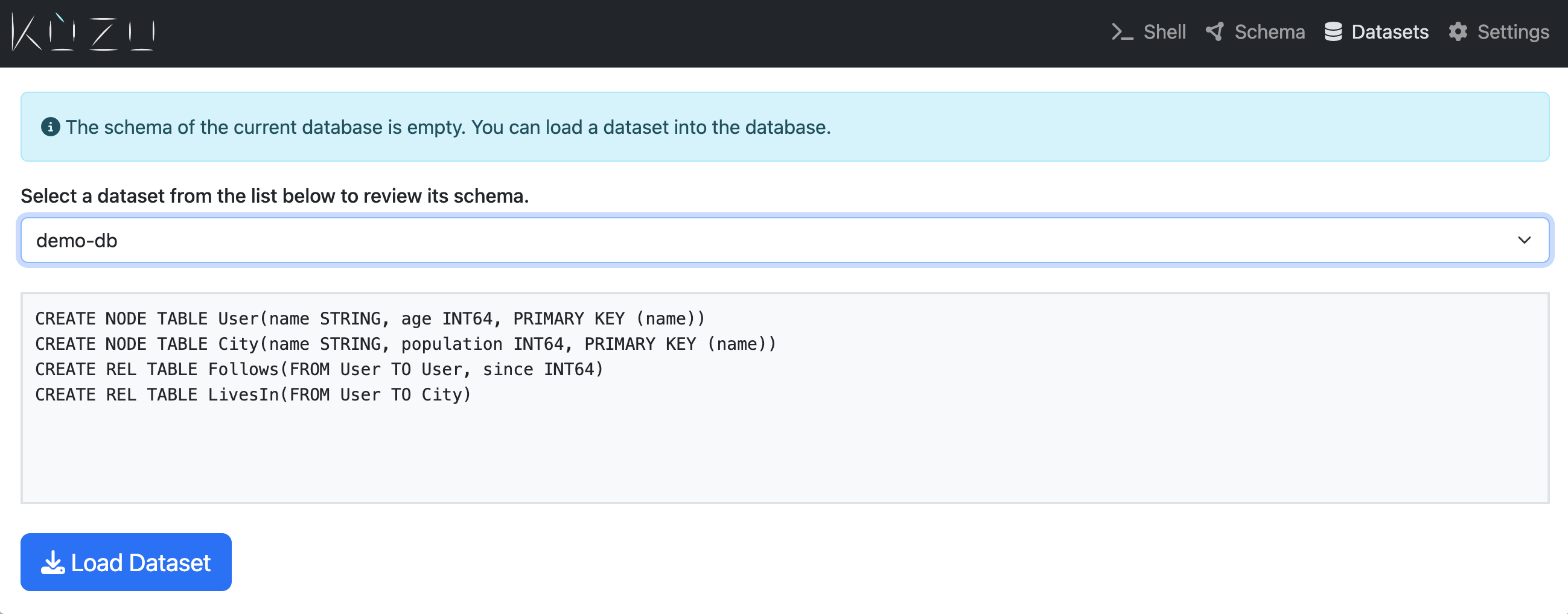 KùzuExplorer comes bundled with several pre-existing databases, one of which you can use to get started.
