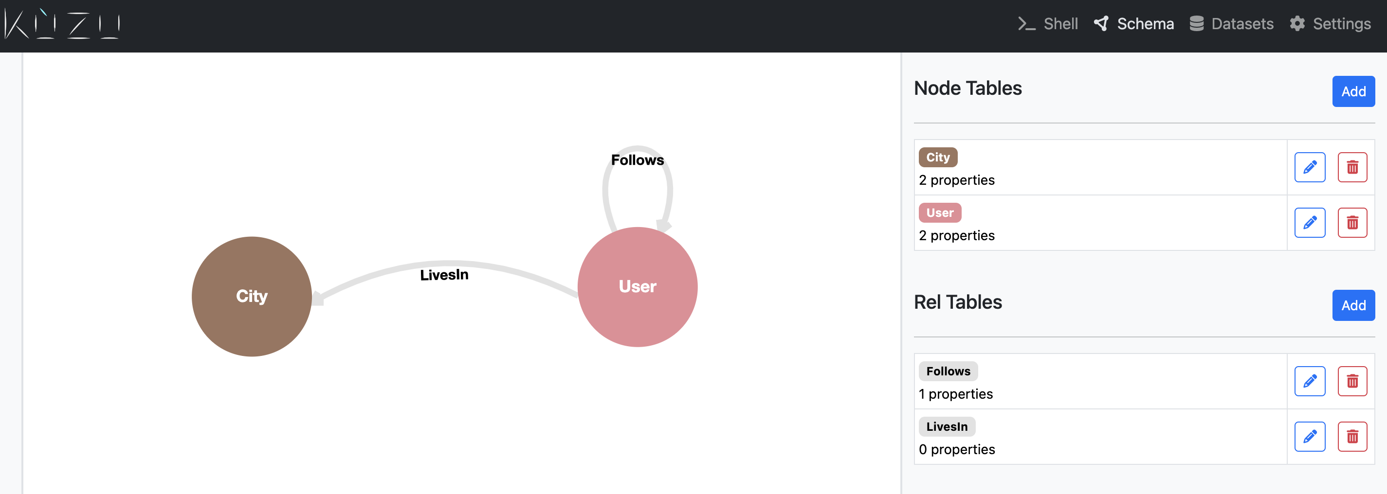 One of the two main functionalities of KùzuExplorer is to explore and modify the schema of your database.