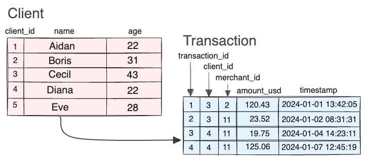 - What connections exist between Client A and Client B (maybe they transacted with the same merchant, or with merchants in the same city, or with merchants belonging to the same company)?