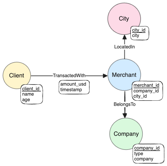 transacted_with.csv: connects a client to a merchantbelongs_to.csv: connects a merchant to its parent companylocated_in.csv: connects a merchant to a city