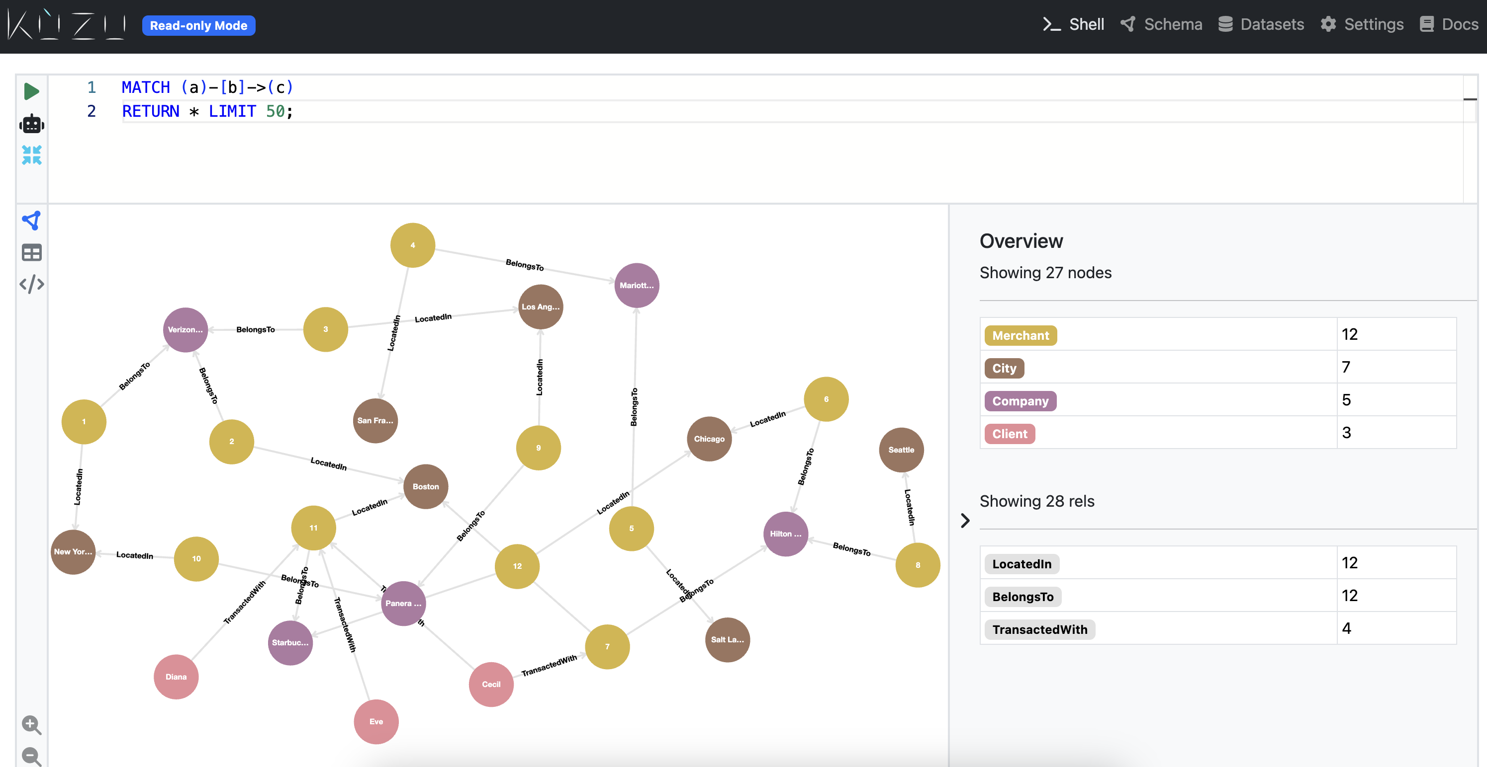 Running Cypher queries in a shell editor is great during initial testing, but on completion, obtaining visual feedback is very useful in refining the data model. In a recent blog post, we introduced Kuzu Explorer, a browser-based frontend that allows users to visualize their graph data and run queries interactively.