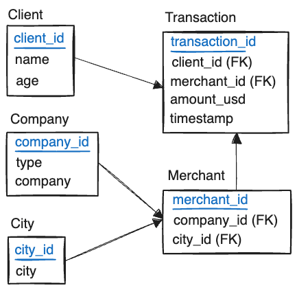 The client table stores unique client IDs and their metadata. The merchant table stores unique instances of merchants and what parent company they belong to. Transaction data is stored in the transaction table, which shows the transaction ID, the client ID, the merchant ID, the amount of the transaction and when it occurred. Company and city tables exist to store metadata about the parent companies and cities where the merchants are located. The connectivity between the tables is expressed via foreign key constraints.