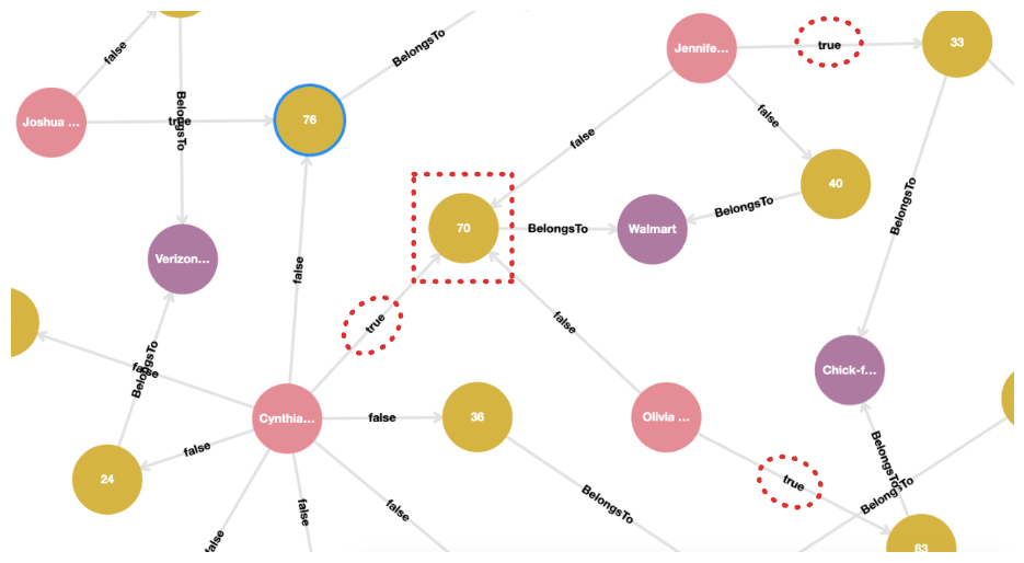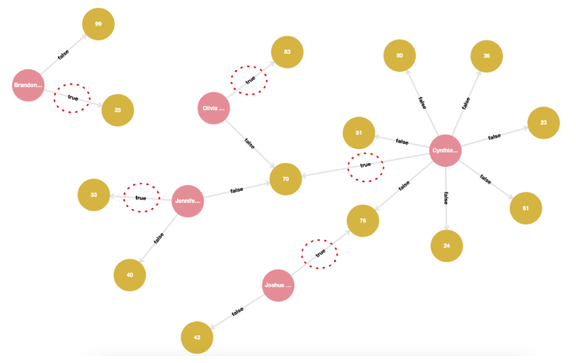 the following image, we mark the TransactedWith edges with the boolean value of the is_disputed