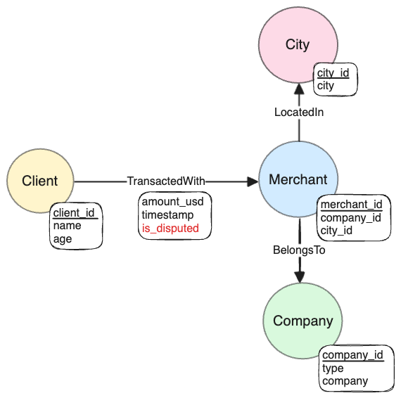 When considering questions about disputed transactions, aggregation queries are not enough. We need to study the paths between the clients, merchants and transactions. This is where a graph database like Kuzu is very handy. The data model used by Kuzu is a structured property graph model, allowing us to capture the relationships between entities in a more natural way, for specific query workloads such as this one.