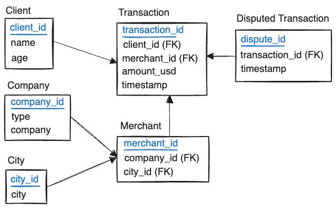 provides goods or services. The disputes table contains records of all the disputed transactions,